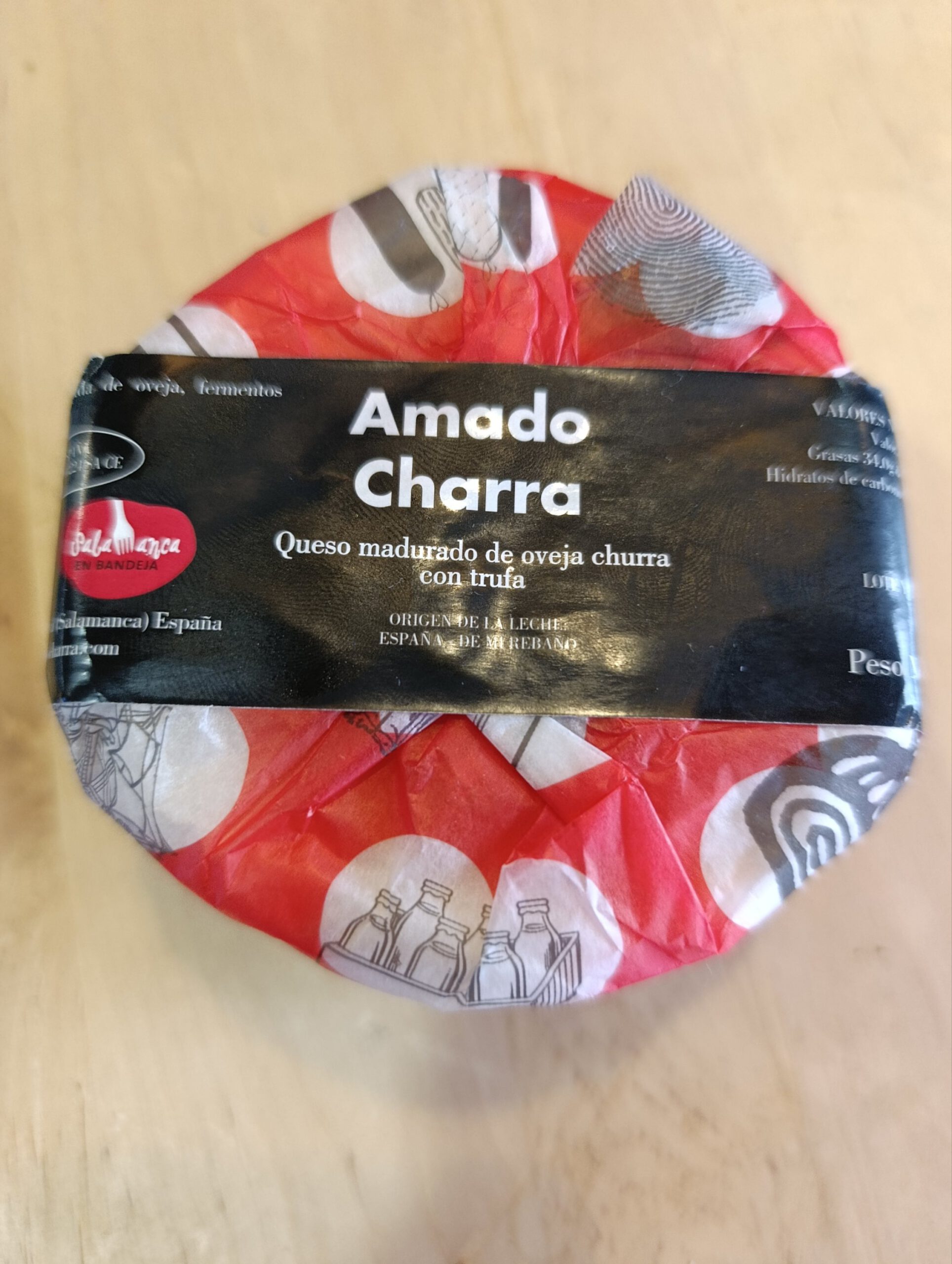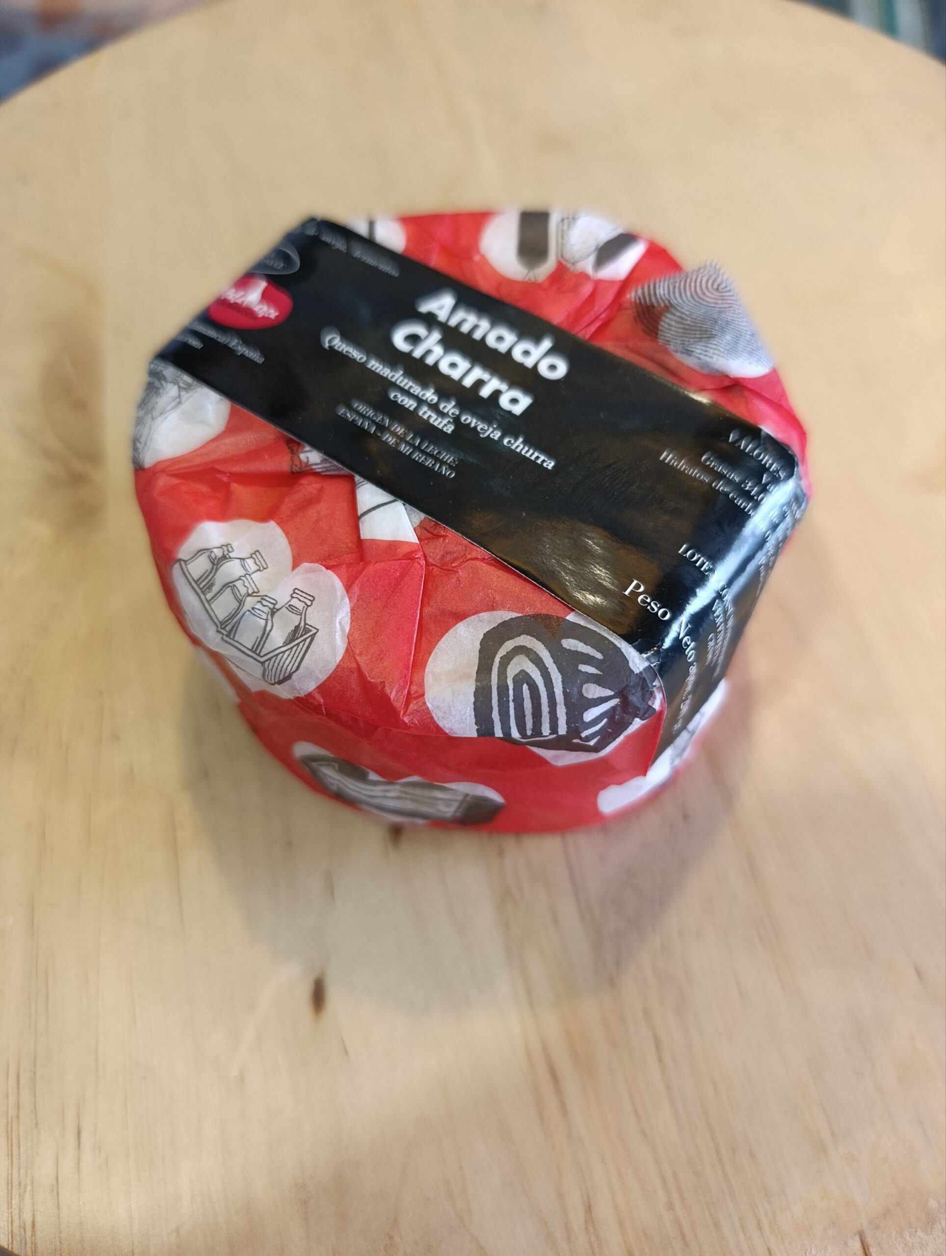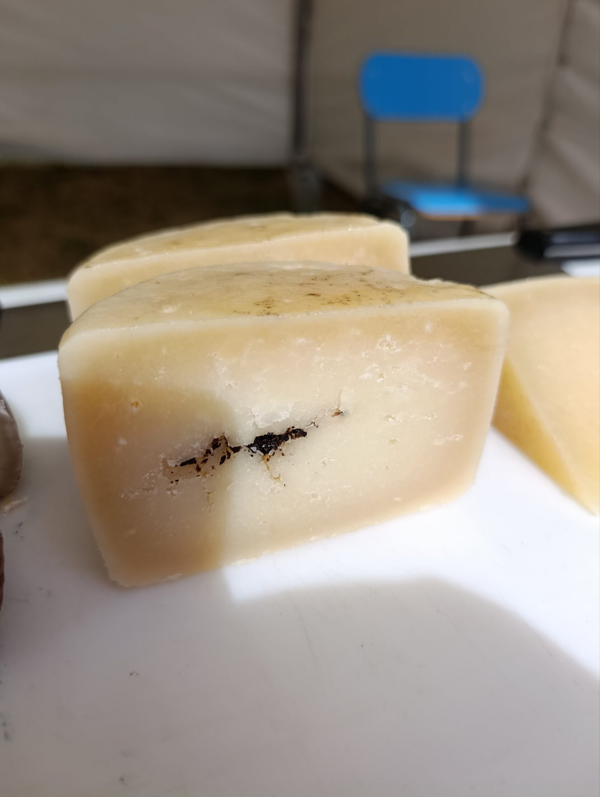 Queso madurado de oveja churra con trufa melanosporum. Elaborado con leche cruda de nuestras propias ovejas churras (raza autóctona) en pastoreo en la Sierra de Francia (Salamanca)